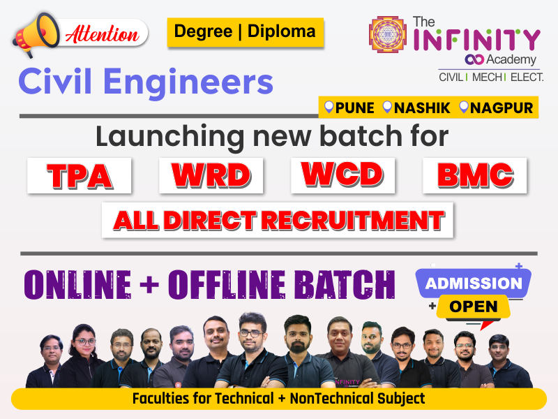 Covers Technical + Non Technical Subject Best Faculty Pool Ever for Civil Engineering Competitive Exams Location : Pune, Nashik, Nagpur Features ✔️ दररोज 5+ तासांचे Lectures ✔️ प्रत्येक विषयासाठी त्या विषयातील Expert Faculty ✔️ 2 Subjectwise Tests for every subject. ✔️ 5 Full Syllabus Test As per TCS | IBPS Pattern ✔️ प्रत्येक विद्यार्थ्याकडे वैयक्तिक लक्ष्य ✔️ Live Lectures नंतर अनेकदा रेकॉर्डेड स्वरूपात बघता येईल. ✔️ Online Batch चा Online Access 6 महिन्यांपर्यंत असेल.